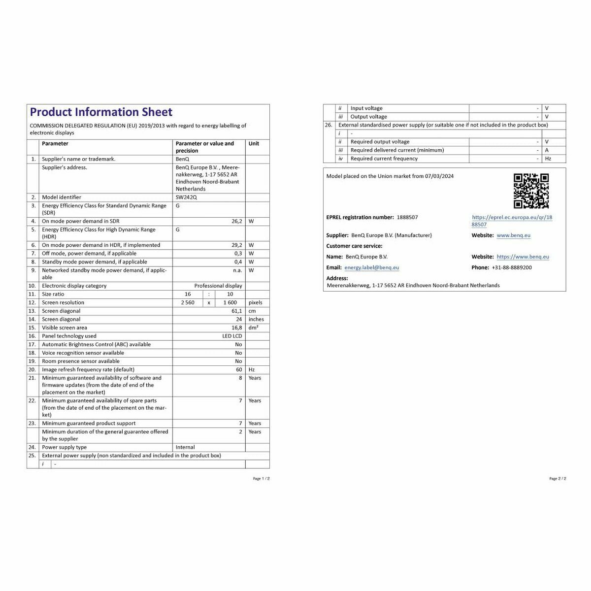 The BenQ SW242Q is a professional 24.1-inch monitor designed to deliver an advanced visual experience and high color accuracy, ideal for photographers, designers, and content creators who require strict control over their visual workflow. This model features an IPS panel with LED technology that ensures faithful and consistent color reproduction from wide angles, thanks to its 178° horizontal and vertical viewing angle. Its native resolution of 2560 x 1600 pixels (WQXGA) with a 16:10 aspect ratio offers a taller viewing area than the standard 16:9, facilitating tasks that need extra vertical space, such as photo editing and graphic design. It also supports HDR10, allowing enhanced dynamic range for images with deeper contrasts and more vibrant colors. The matte screen finish optimizes visibility under various lighting conditions, minimizing reflections and eye strain. The 5 ms response time is suitable for creative environments and some multimedia versatility without compromising image quality. Regarding ergonomics, the SW242Q includes an adjustable height stand and swivel base, allowing comfortable adaptation to user needs or workspace, and it is also VESA compatible. It offers advanced connectivity with a USB 3.2 Gen 1 port for fast transfers and peripherals, maximizing comfort and efficiency at the workstation. Its matte black design with a sober, professional finish fits any office or studio environment. Overall, the BenQ SW242Q is a solid choice for professionals seeking a high-precision monitor with technical versatility, balancing visual performance and ergonomic functionality suited for demanding creative work.